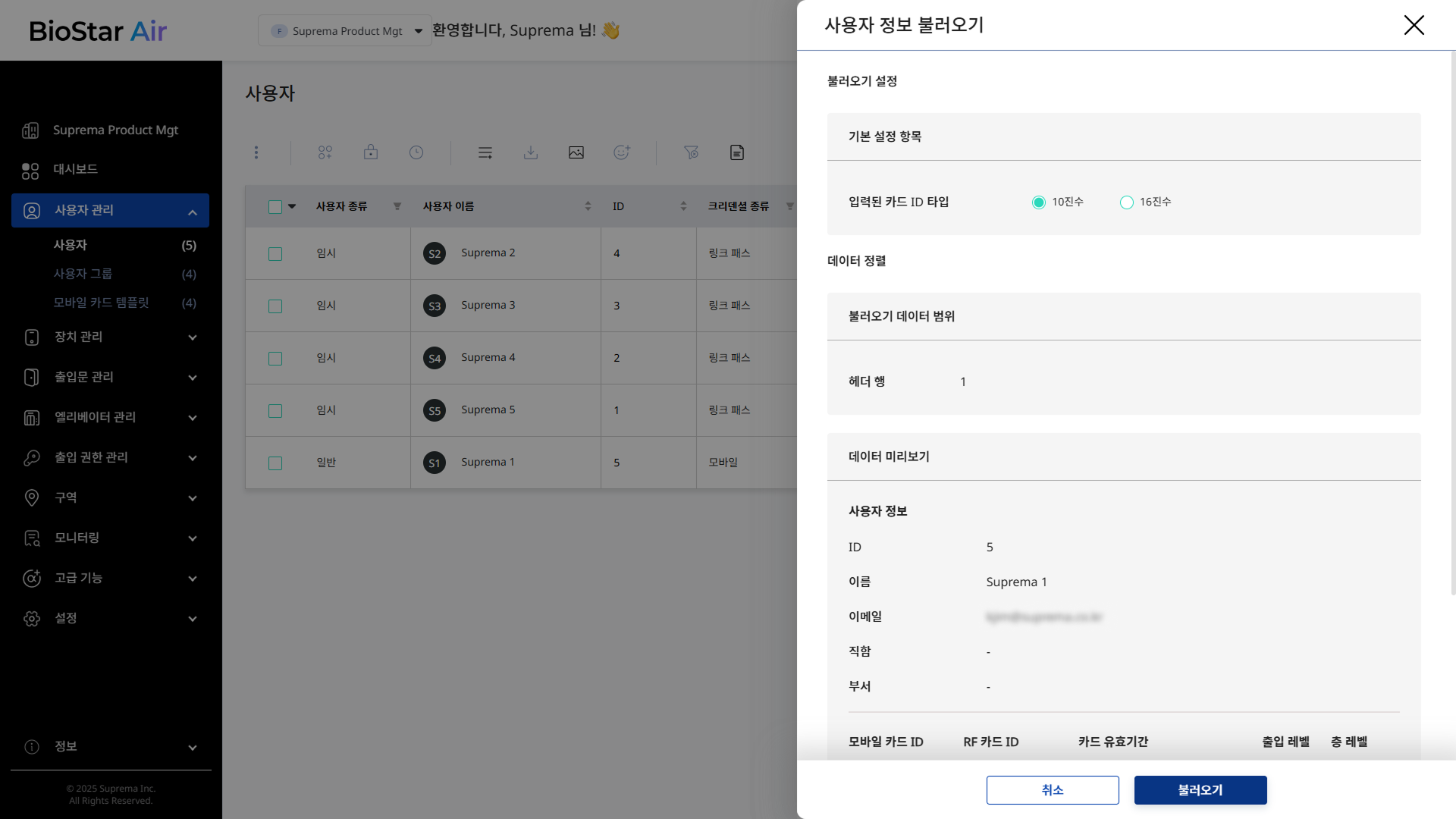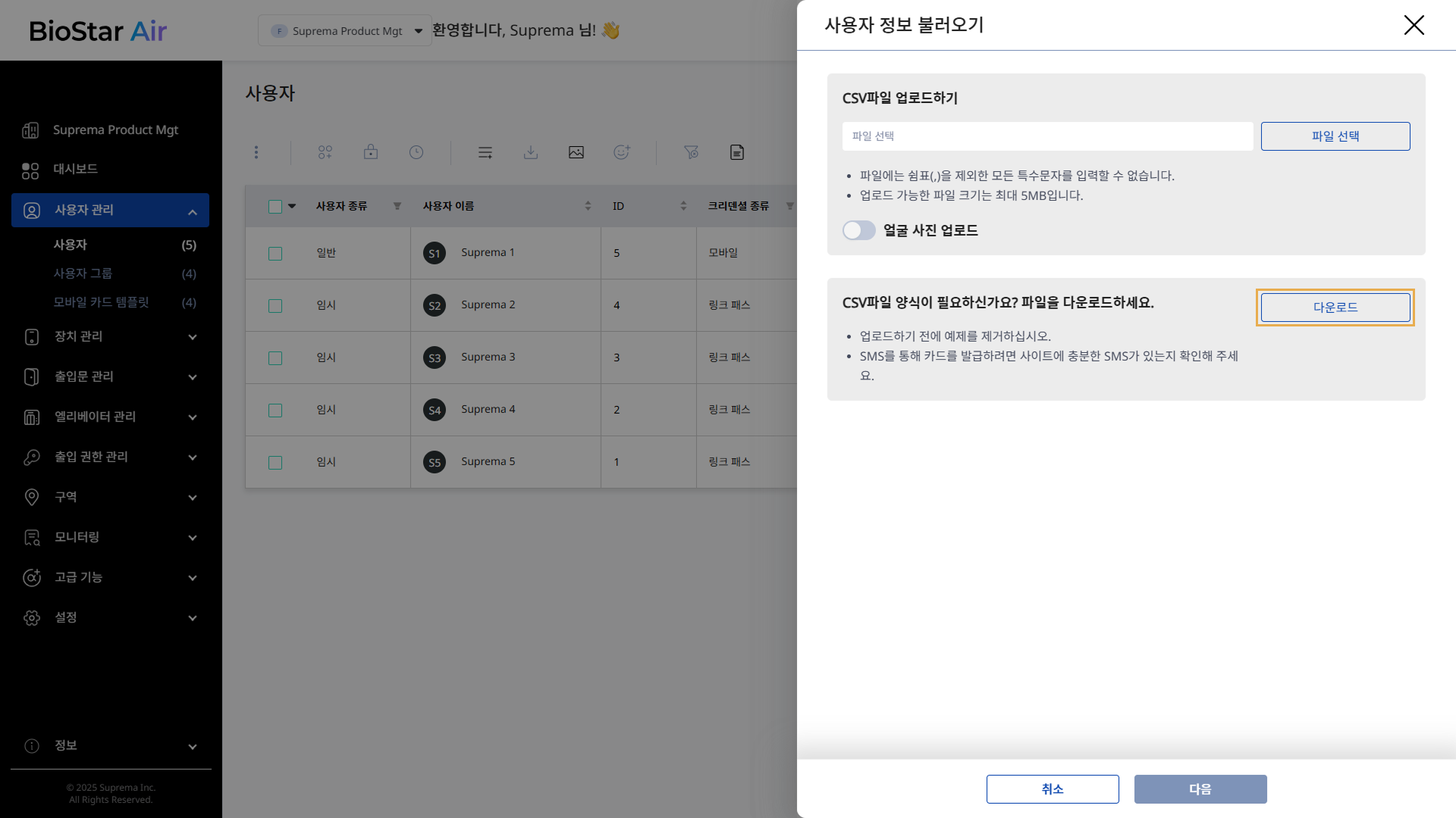 BioStar Air는 관리자가 CSV 파일을 사용하여 여러 사용자를 한 번에 추가할 수 있습니다. 이 기능은 직원 온보딩, 사이트 업그레이드 또는 임시 출입 요구 사항을 효율적으로 처리하는 데 유용합니다.