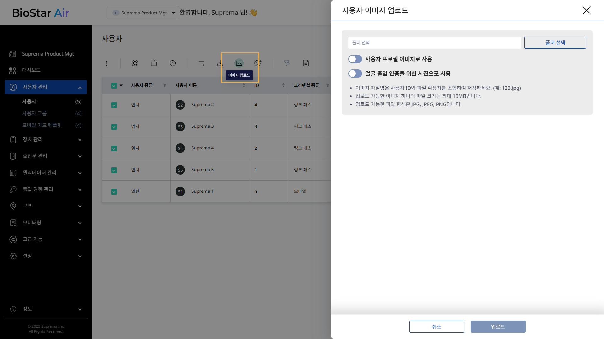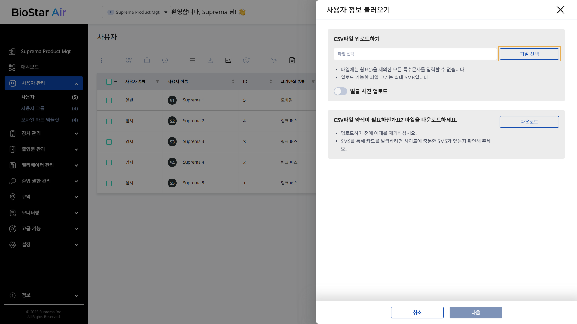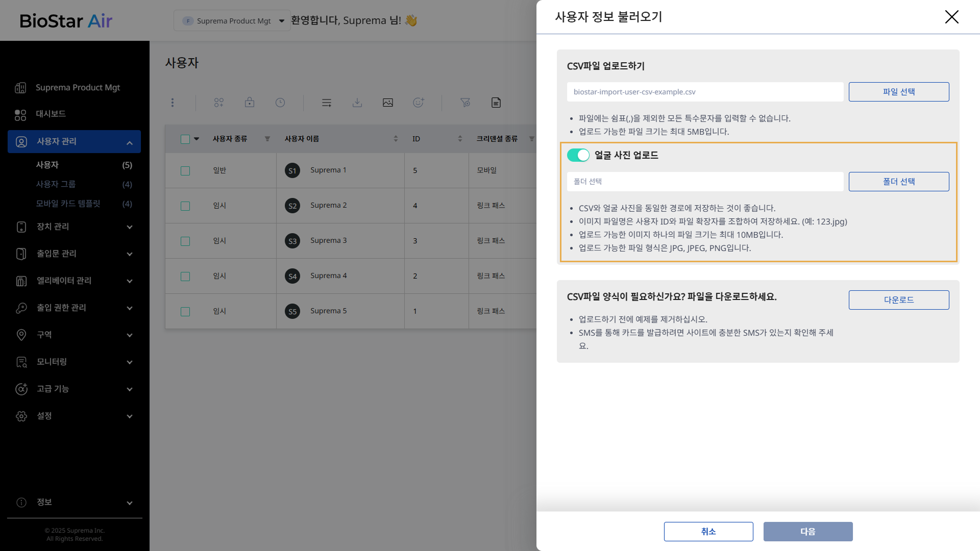 사용자 정보 불러오기 패널에서 CSV 파일을 업로드 후 얼굴 사진 업로드 옵션을 활성화하세요.