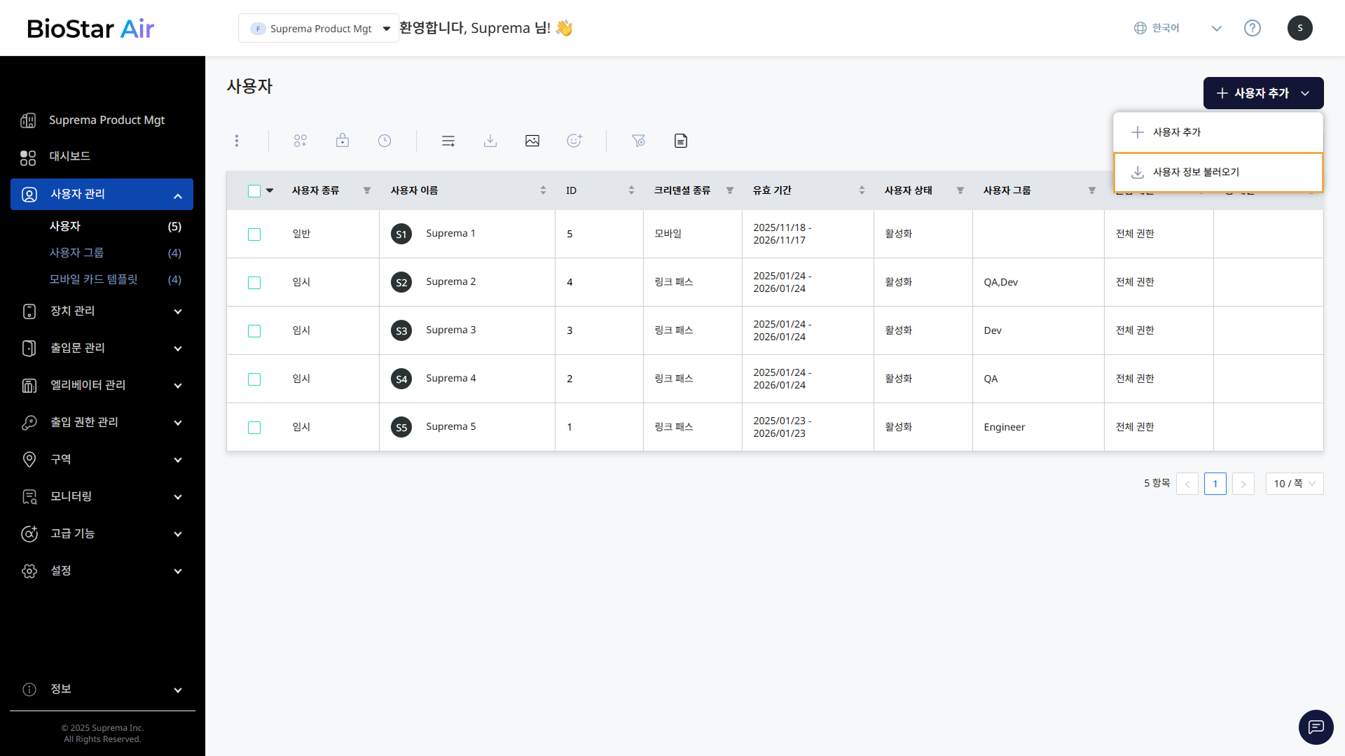 2025년 5월 이전에 BioStar Air 출입 통제 서비스를 사용하기 시작한 고객은 현재 Suprema Pass 앱으로 새로 설계된 Airfob Space 앱을 계속 사용할 수 있습니다. 두 앱 모두 동일한 기능을 제공하며 완벽하게 호환됩니다. 기존 사용자는 전환할 필요가 없으며, 모바일 인증 정보가 두 앱 모두에서 원활하게 작동합니다.