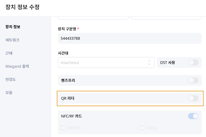 장치 정보 섹션에서 QR 리더 옵션을 활성화하세요.