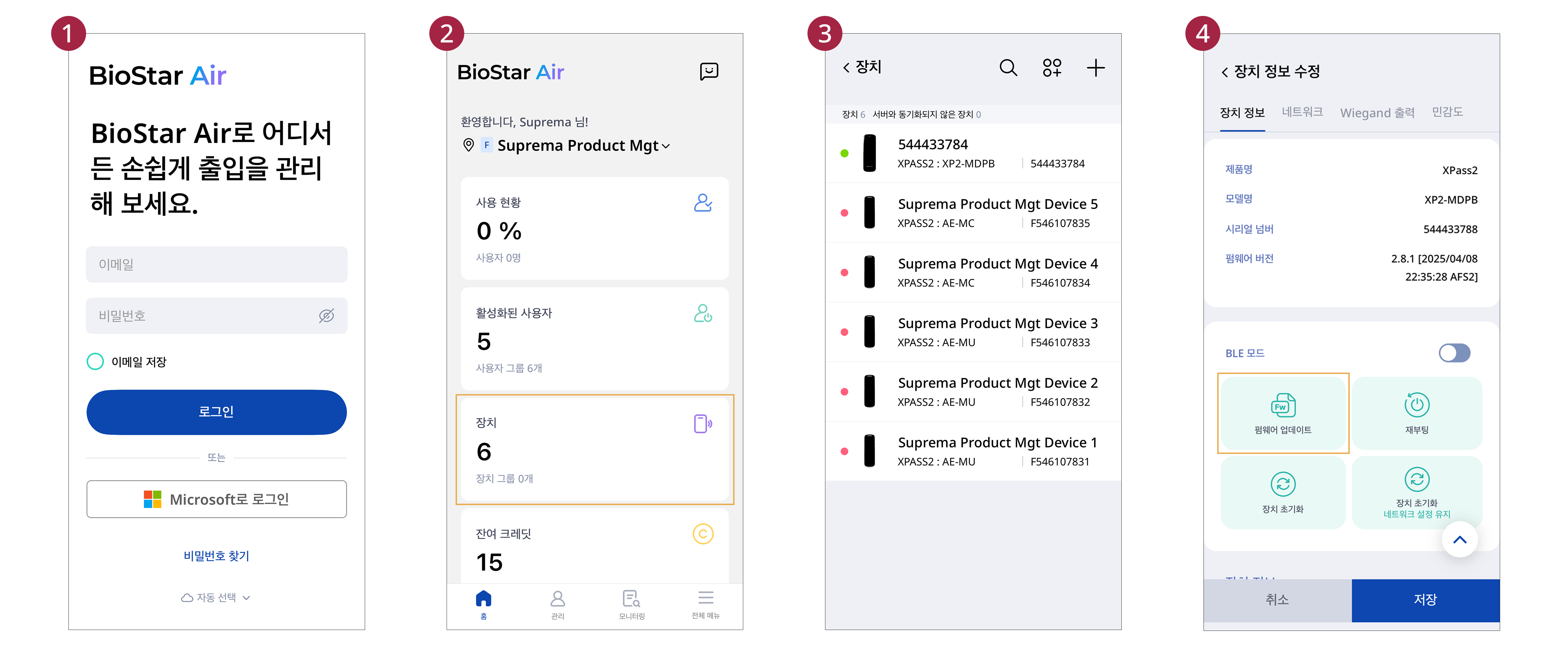 BioStar Air 포털에 로그인한 후 다음 단계를 따라 펌웨어를 업그레이드하세요.