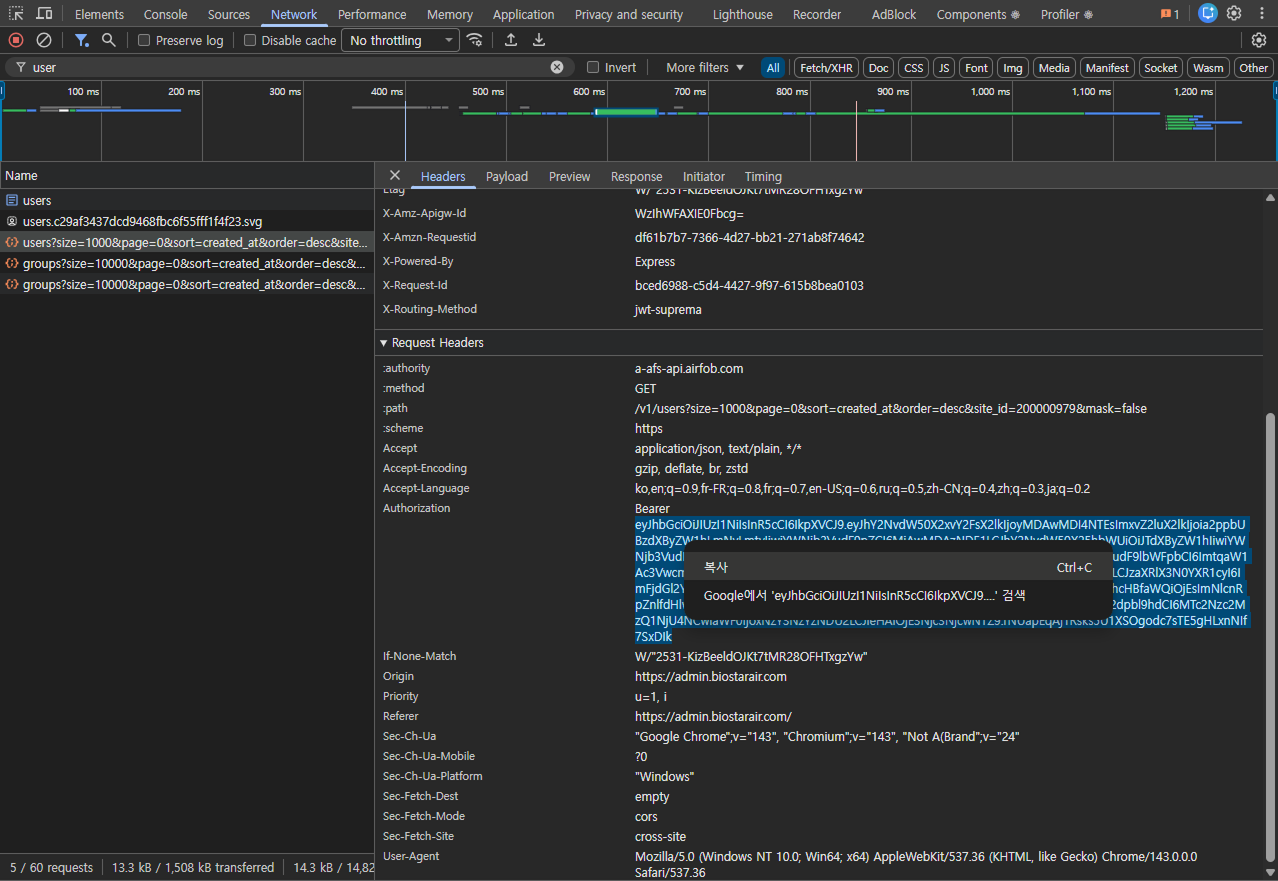 브라우저에서 복사한 Bearer 토큰은 Postman에서 재사용할 수 있습니다.