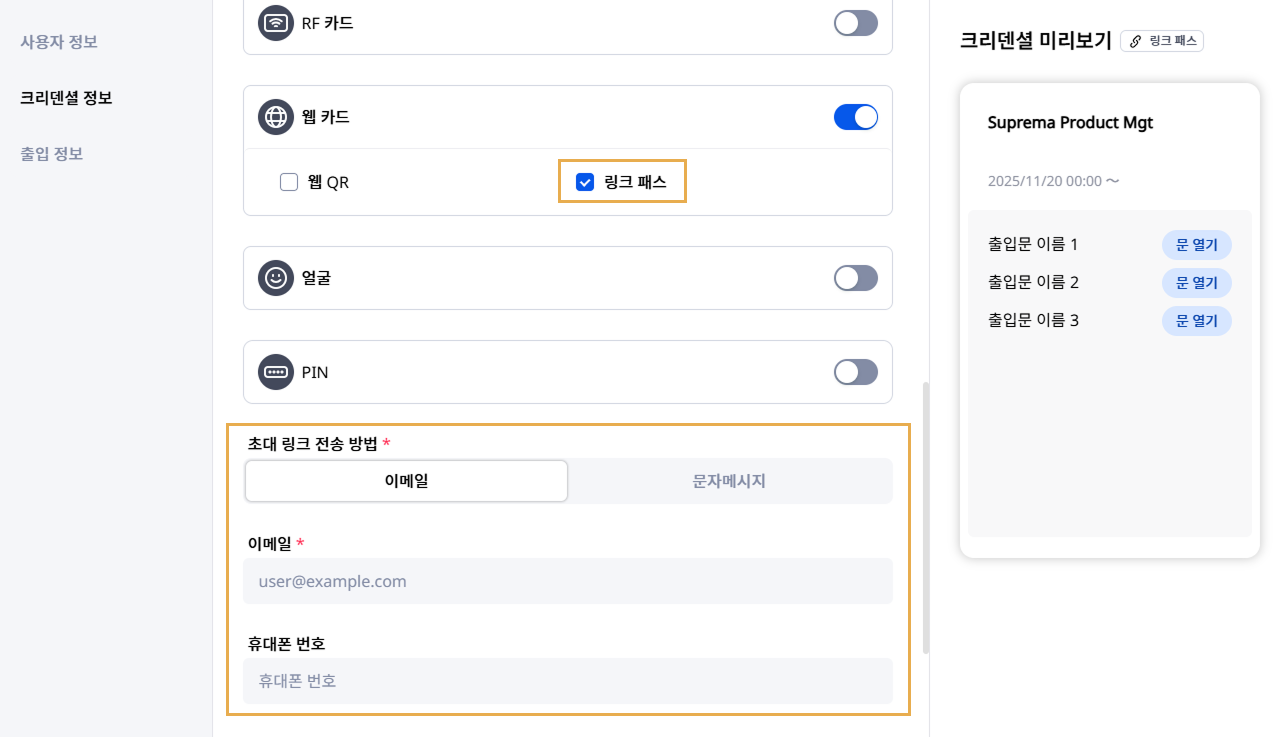 초대 링크 전송 방법에서 사용자가 크리덴셜 링크를 받을 수 있는 고유한 이메일 주소 또는 휴대폰 번호를 입력하세요.