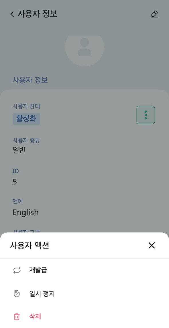 사용자 목록에서 사용자를 탭하세요. 사용자 정보 화면에서 버튼을 탭하세요. 사용자 액션 메뉴가 나타납니다.