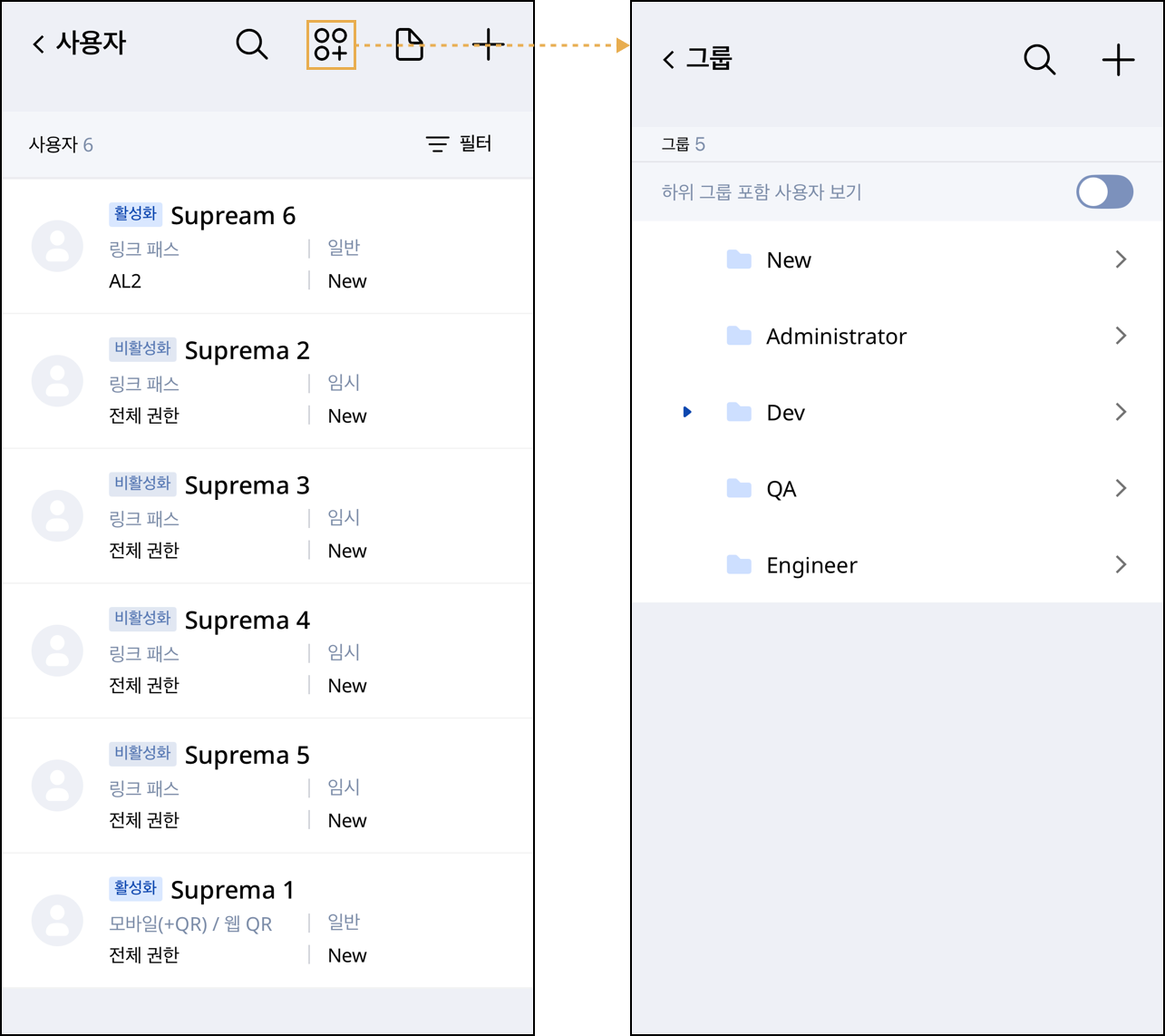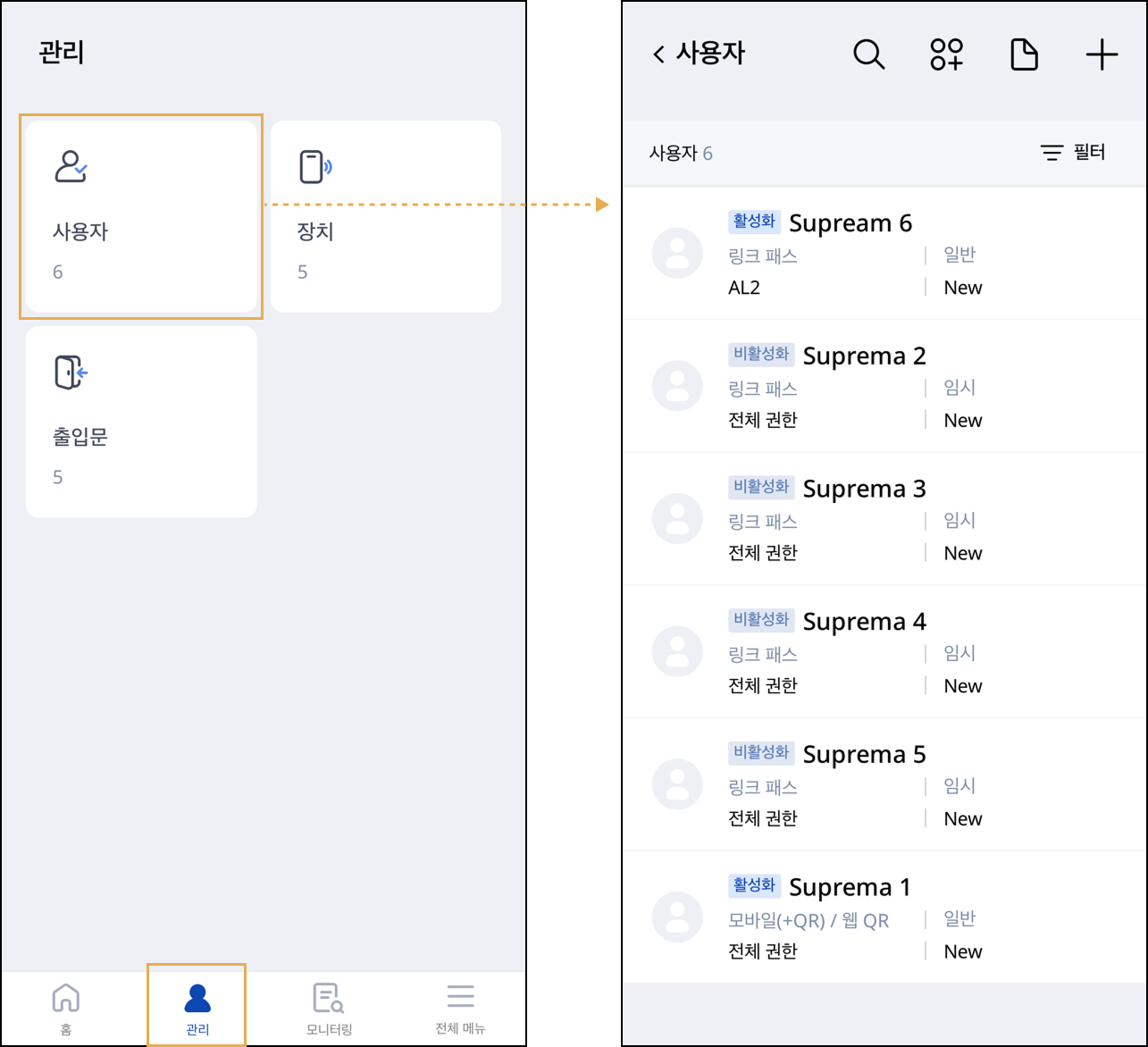 BioStar Air 앱에서 사용자 관리 기능을 사용할 수 있습니다.