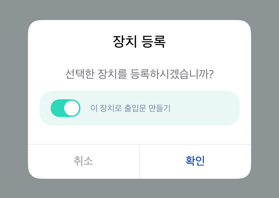 모바일 앱에서 장치 등록 시 마지막 단계에서 이 장치로 출입문 만들기 옵션을 선택하면 출입문을 생성할 수 있습니다. 모바일 앱으로 장치를 등록하는 방법에 대한 자세한 내용은 장치 등록 및 삭제하기를 참고하세요.