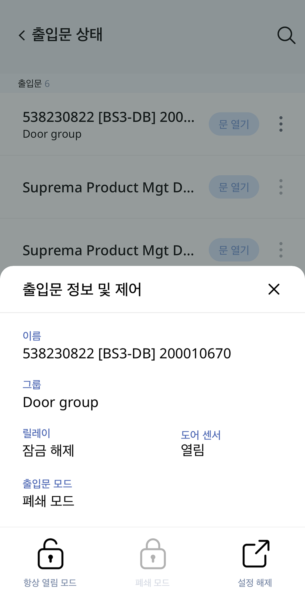 모바일 기기에서 BioStar Air 앱을 사용하여 출입문 상태를 확인할 수 있습니다.
