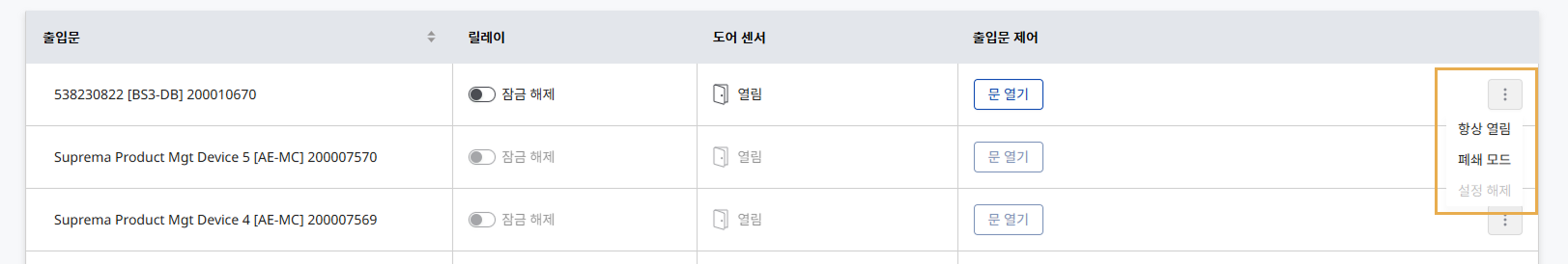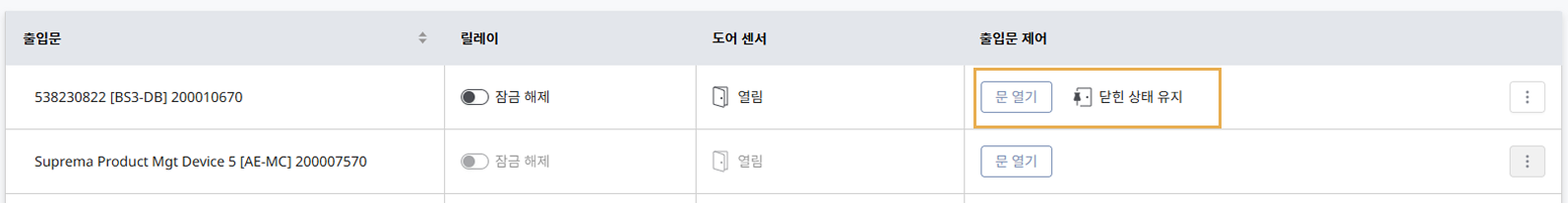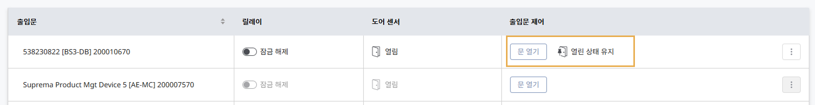 출입문 제어 열에 열린 상태 유지로 상태가 변경됩니다.