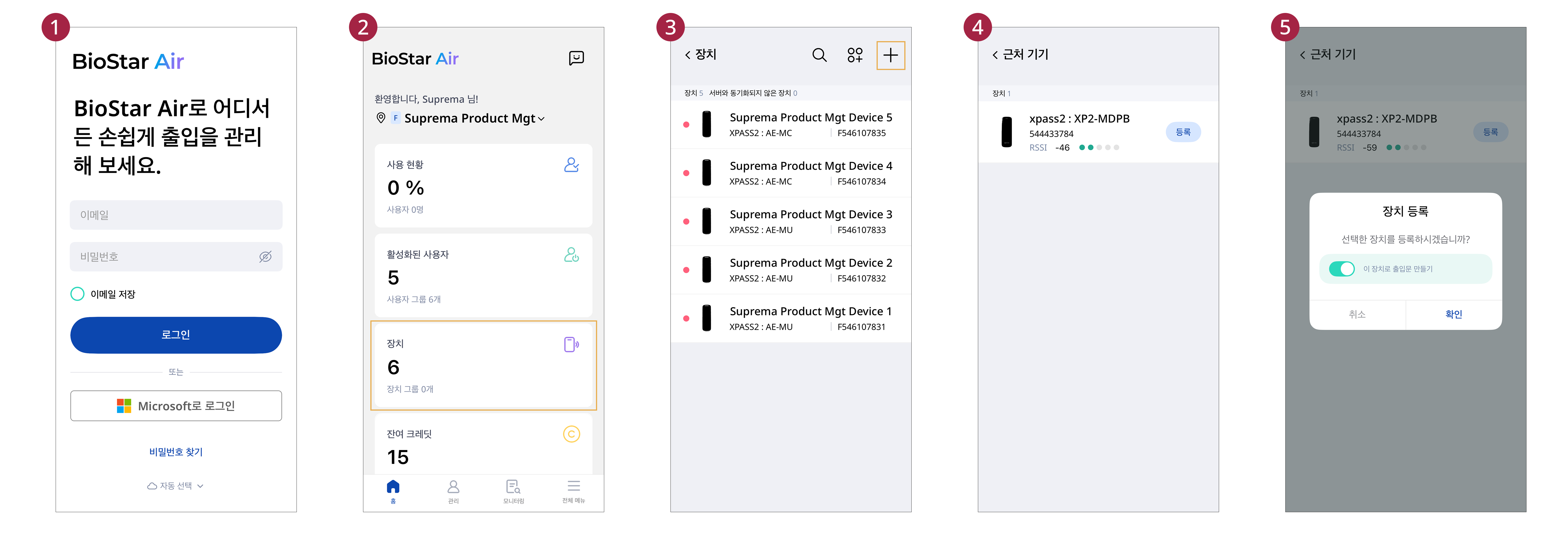 BioStar Air 모바일 앱을 사용하여 장치를 등록할 수 있습니다. 장치 등록은 BLE 방식으로 이루어지며, 등록된 장치는 BioStar Air 플랫폼에서 관리할 수 있습니다.