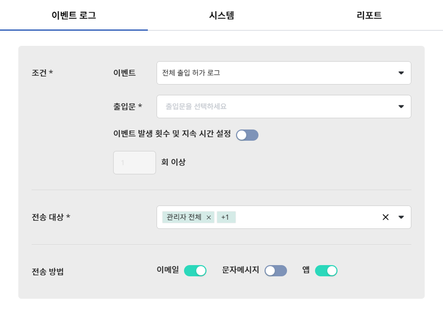 이벤트 로그 탭에서 이벤트 종류에 따라 알림 발생 조건을 설정할 수 있습니다.