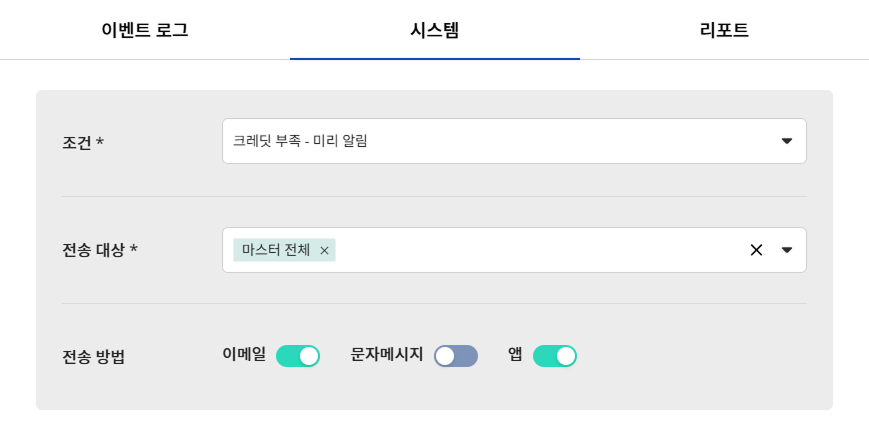 전송 방법에서 알림을 전송할 수단을 선택하세요. 이메일, 문자 메시지, 앱 푸시 알림의 방법으로 알림을 전송할 수 있습니다.