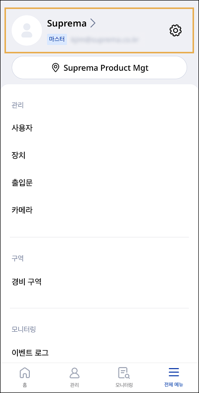 BioStar Air 모바일 앱: 초기 화면에서 하단의 전체 메뉴를 탭한 후 사용자 프로필 영역을 탭하세요.