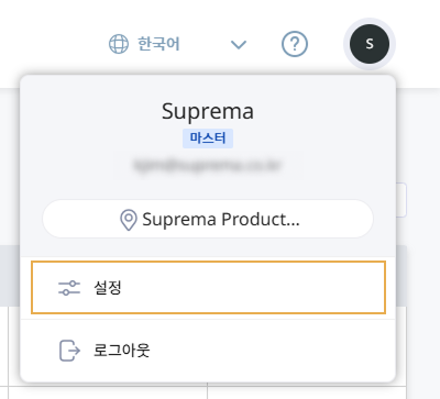BioStar Air 포털: 화면 오른쪽 상단의 사용자 프로필 아이콘을 클릭한 후 설정을 선택하세요.