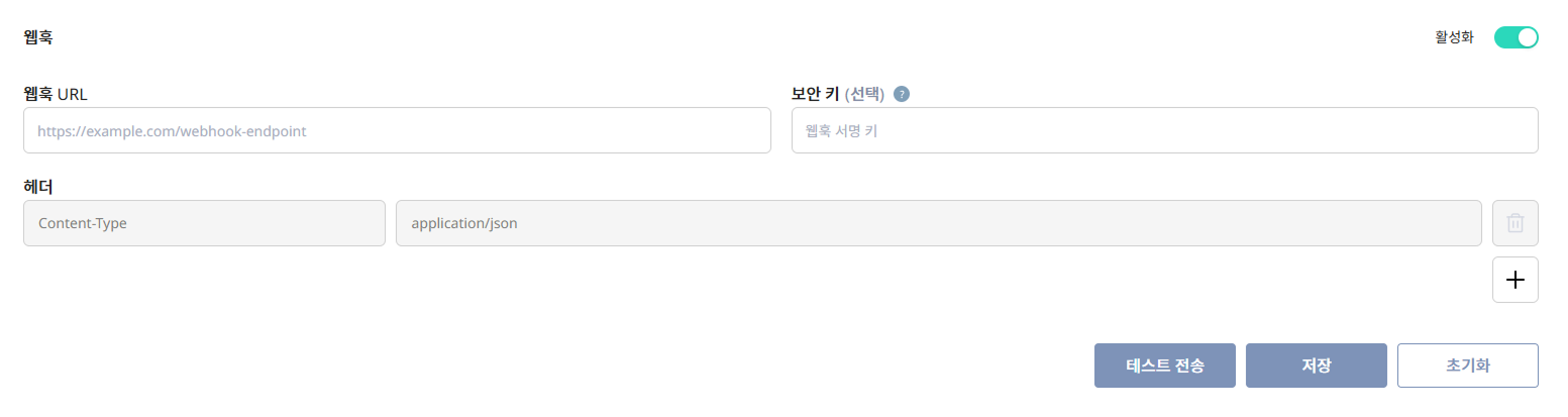 보안 키: 웹훅 요청이 신뢰할 수 있는 발신 서버에서 전송되었는지 검증하는 보안 토큰입니다. 발신 서버는 보안 키를 이용해 데이터 본문(Payload)을 SHA256으로 암호화하고, 헤더에