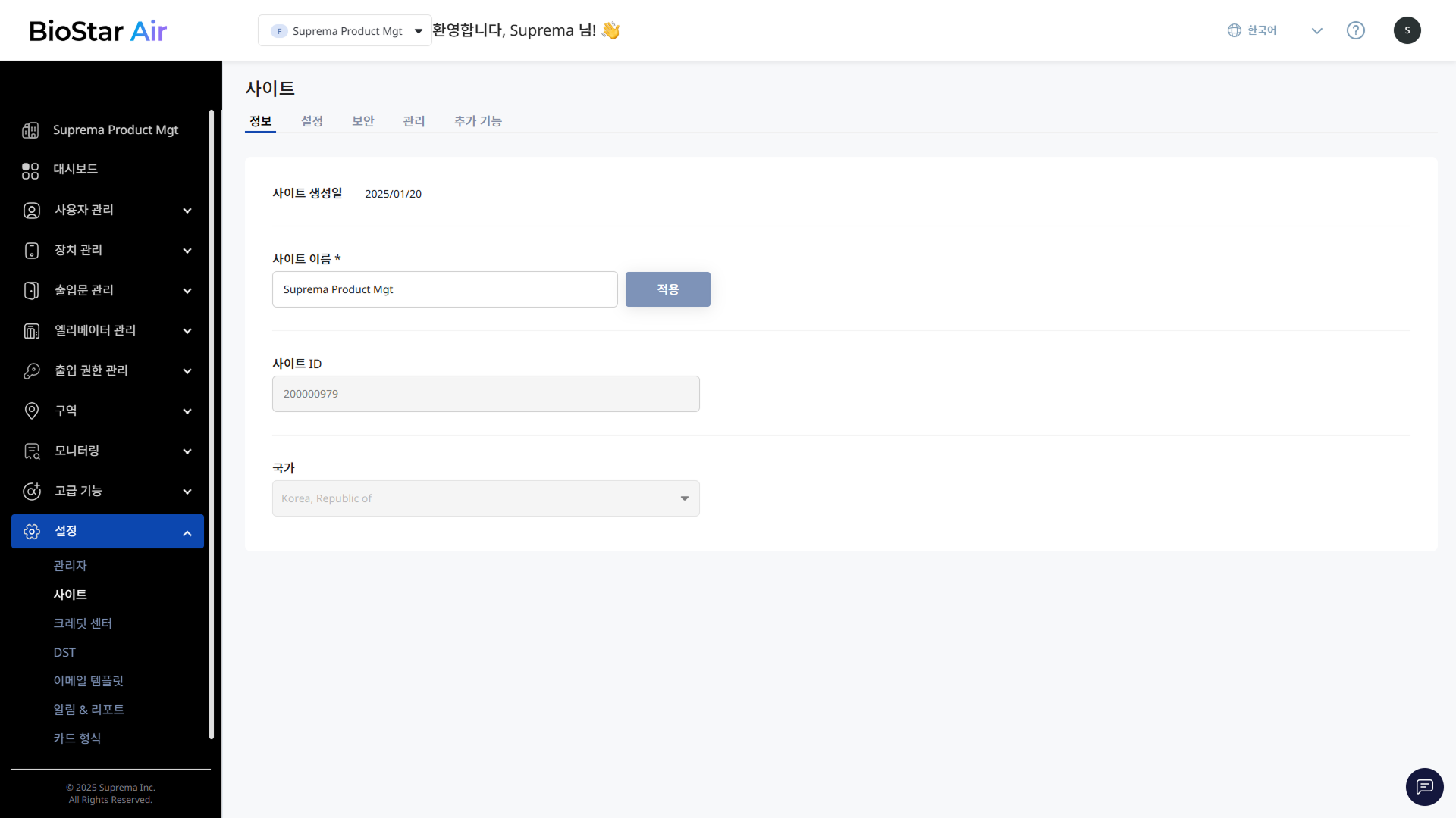 국가: 사이트 생성 시 설정되며 나중에 변경할 수 없습니다. 변경이 필요하면 BioStar Air 파트너 포털을 통해 진행해야 합니다.