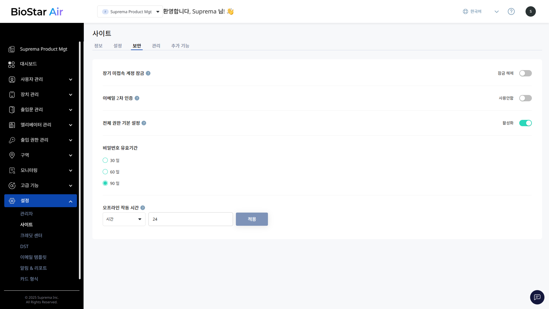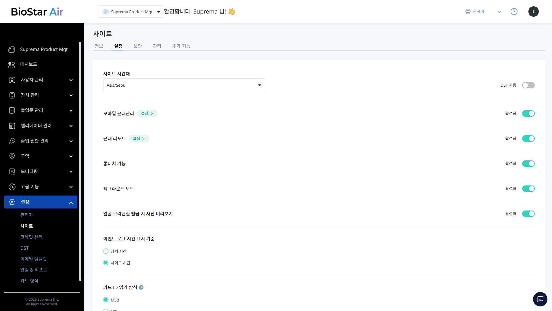 BioStar Air에서 사이트 설정을 관리하는 것은 효과적인 관리에 필수적입니다. 이 문서에서는 사용할 수 있는 설정과 구성 방법을 안내합니다.