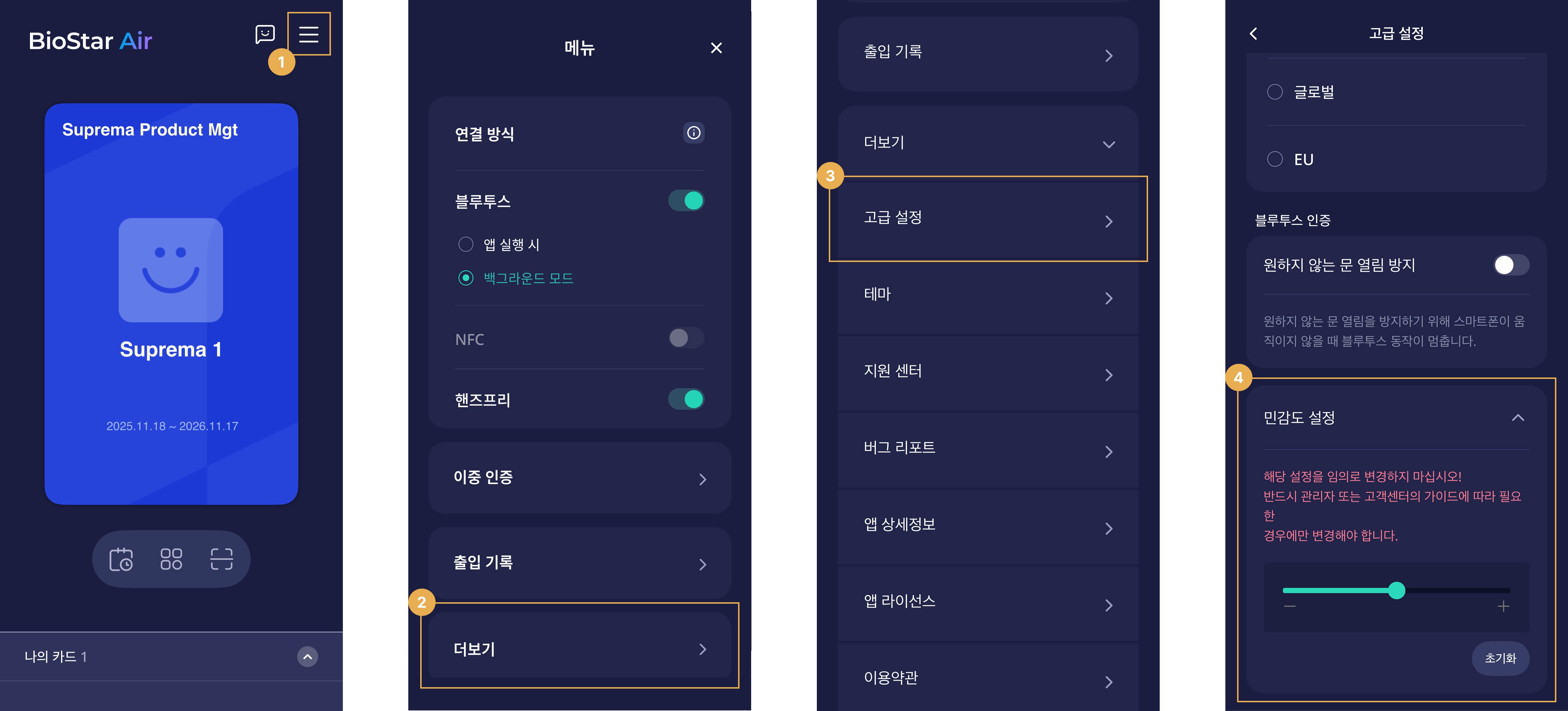 사용자는 모바일 기기의 블루투스 강도와 개인적 선호도에 따라 블루투스 인증 민감도를 미세하게 조정할 수 있습니다.
