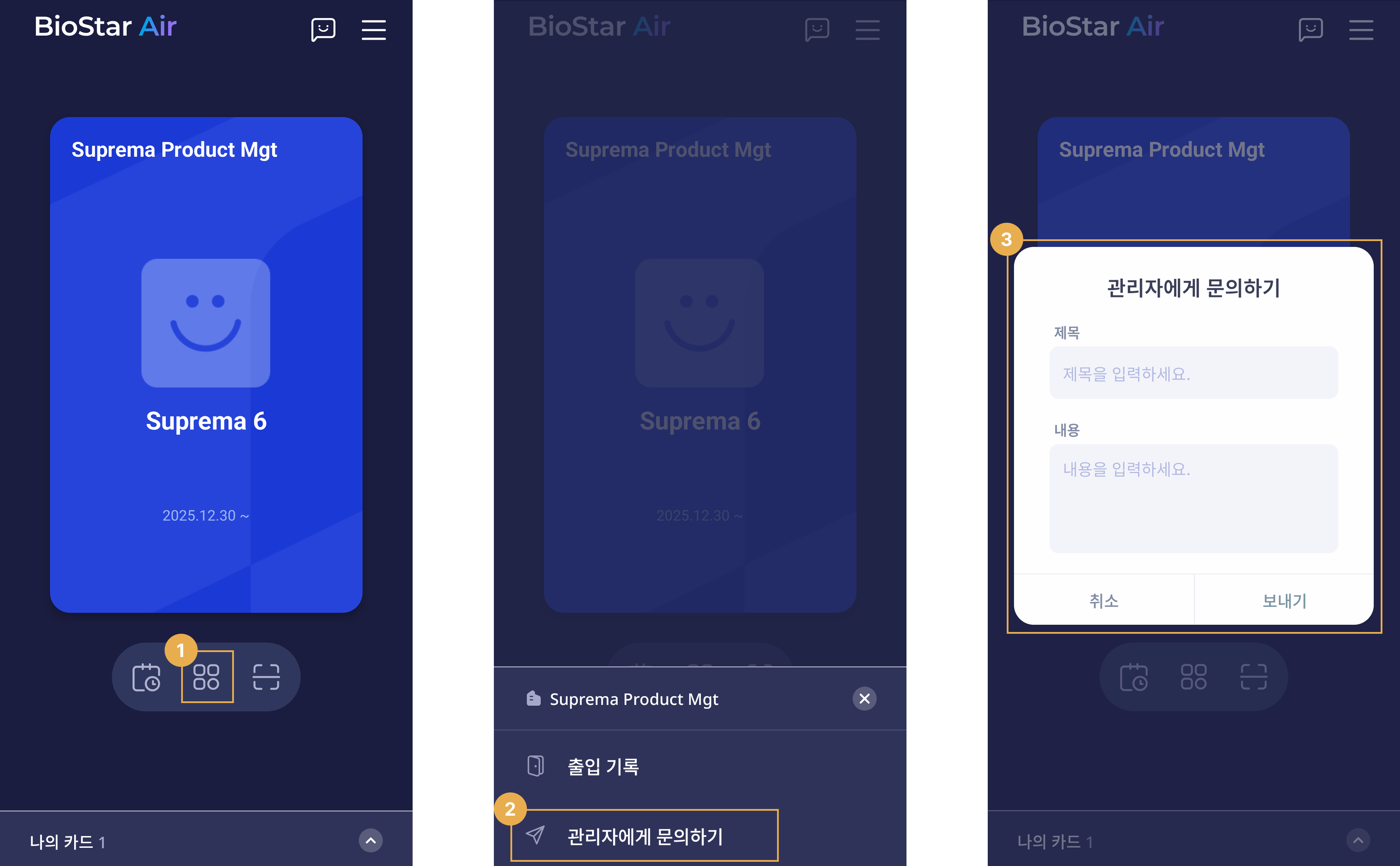모바일 기기의 슈프리마 패스 앱에서 모바일 카드 아래에 위치한 아이콘을 탭하세요.