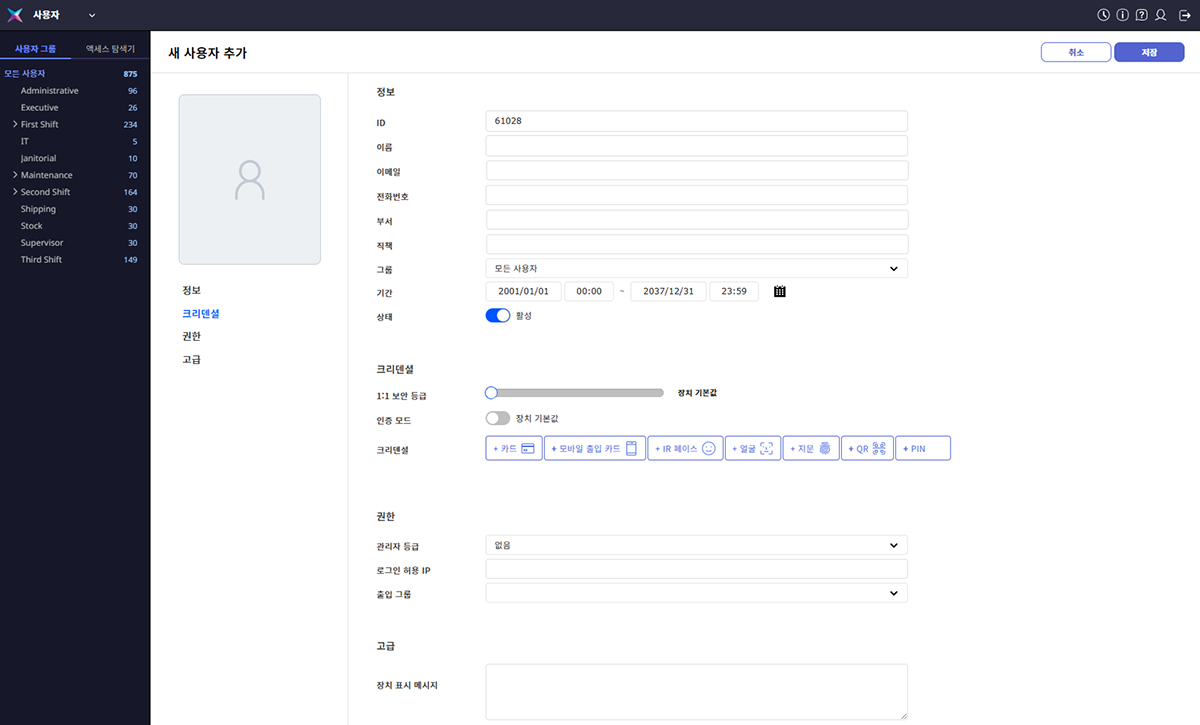 출입 권한 및 생체 인식 정보는 선택 사항입니다. 기본 정보를 입력하고 저장한 후에 수정하거나 추가할 수 있습니다.