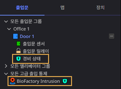 경비 상태의 출입문은 경비 상태 아이콘이 상태에서 상태로 변경됩니다. 이때 해당 출입 통제 설정에도 아이콘이 적용됩니다.