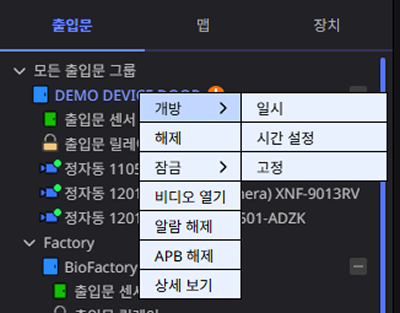 런처 페이지에서 모니터링을 클릭하거나 화면 왼쪽 상단의 바로 가기 목록에서 모니터링을 선택하세요. 제어하길 원하는 출입문을 선택하고 마우스 오른쪽 버튼을 클릭하세요. 팝업 메뉴에서 원하는 기능을 선택할 수 있습니다.