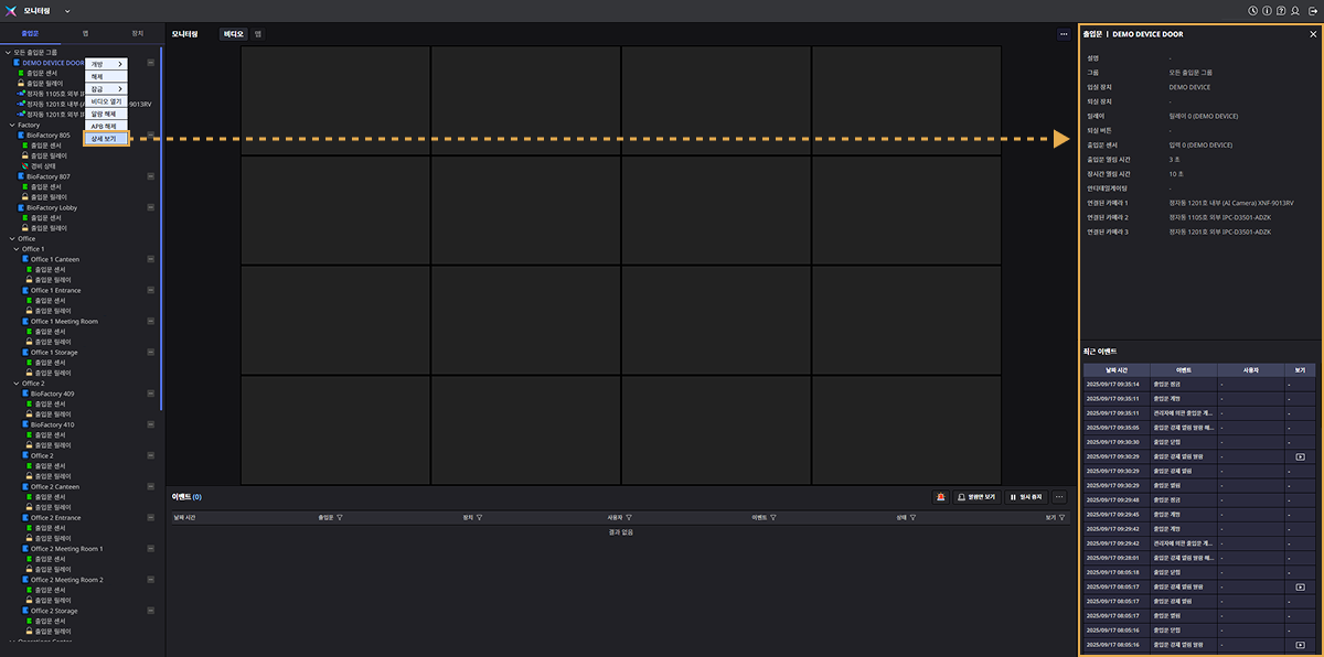 출입문에 대한 상세 정보와 이벤트 발생 이력을 확인할 수 있습니다. 팝업 메뉴에서 상세 보기를 클릭하세요. 화면 오른쪽에 출입문 상세 정보와 이벤트 발생 이력이 표시됩니다.
