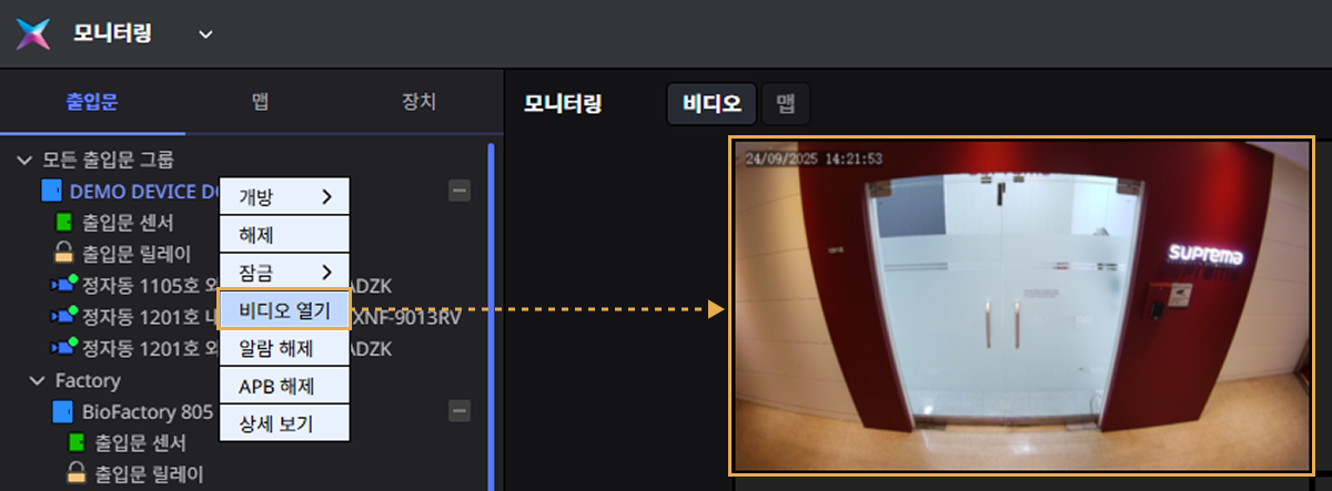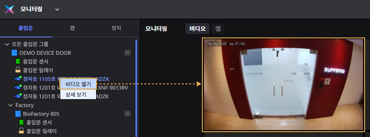 출입문과 연결된 카메라를 확인할 수 있습니다. 팝업 메뉴에서 비디오 열기를 클릭하세요. 모니터링 섹션의 비디오 타일에 선택한 카메라의 영상을 추가하고, 재생할 수 있습니다.