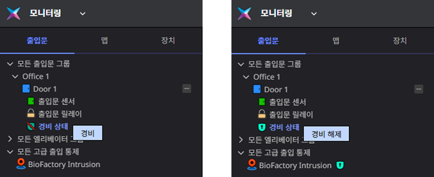 출입문과 연결된 경비 장치를 통해 출입문을 경비 상태로 설정하거나 해제할 수 있습니다. 팝업 메뉴에서 경비 또는 경비 해제를 클릭하세요.