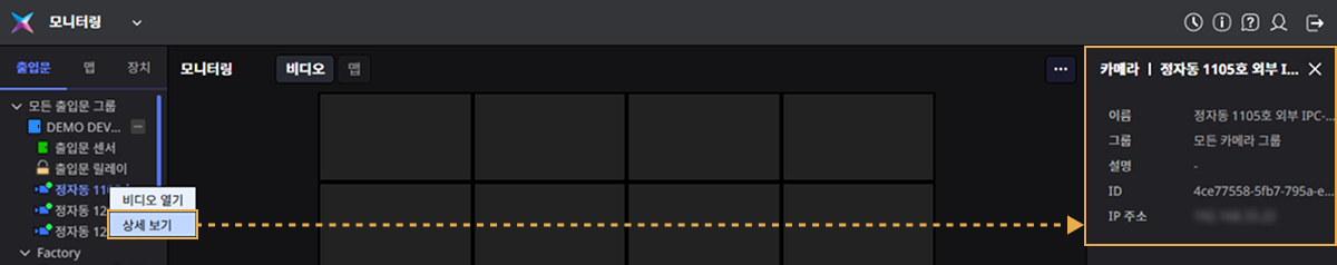 카메라의 상세 정보를 확인하려면, 팝업 메뉴에서 상세 보기를 클릭하세요. 화면 오른쪽에 카메라의 상세 정보가 표시됩니다.