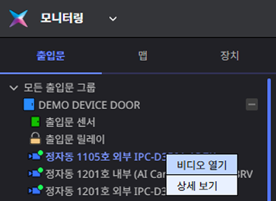 카메라 장치의 영상을 실시간으로 확인하려면, 팝업 메뉴에서 비디오 열기를 클릭하세요. 모니터링 섹션의 비디오 타일에 선택한 카메라의 영상을 추가하고, 재생할 수 있습니다.