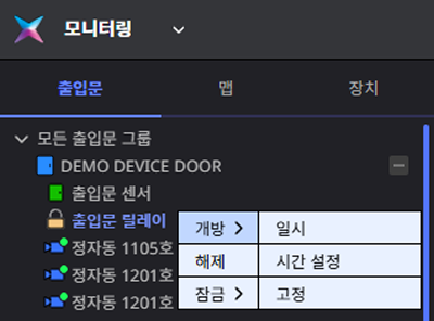 출입문과 연결된 릴레이 장치를 통해 출입문의 잠금을 해제할 수 있습니다. 개방 상태의 출입문은 누구든지 출입할 수 있습니다. 팝업 메뉴에서 개방을 클릭하고 원하는 옵션을 선택하세요.