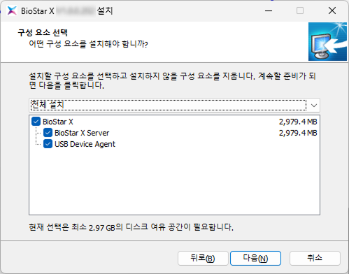BioStar X의 구성 요소를 선택한 뒤 다음 버튼을 클릭하세요. USB Device Agent를 선택하면 BioMini, BioMini Plus 2, BioMini Slim 2, DUALi DE-620을 사용하기 위한 USB Agent와 드라이버를 함께 설치합니다.
