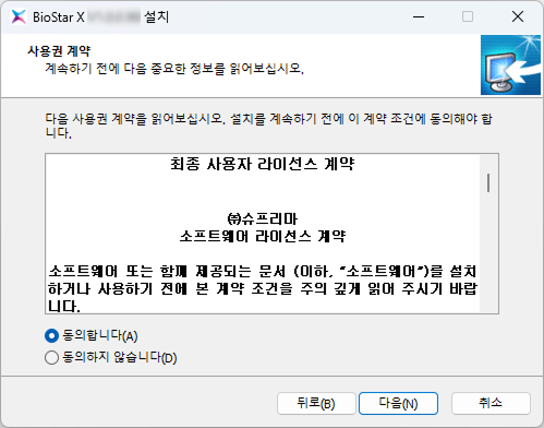 설치를 계속하려면 동의합니다를 선택하고 다음 버튼을 클릭하세요.