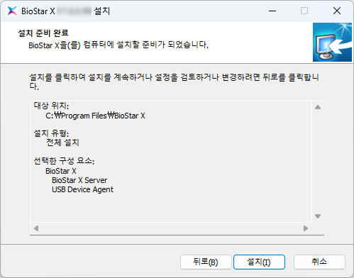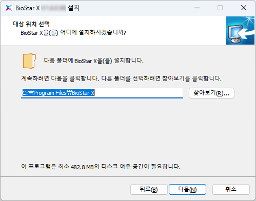 BioStar X를 설치할 경로를 설정하고 다음 버튼을 클릭하세요.