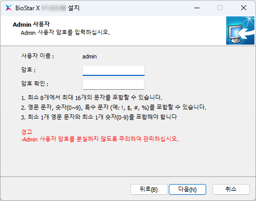 관리자 계정 암호는 BioStar X를 설치한 다음 처음 로그인할 때 사용합니다.