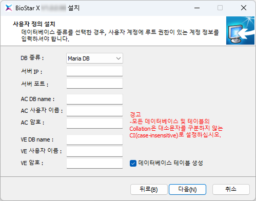 설치 옵션으로 사용자 정의 설치를 선택할 때 AC DB name, TA DB name, VE DB name은 동일하게 설정할 수 없습니다.