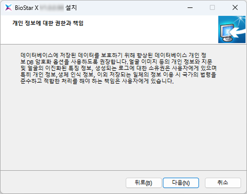 데이터베이스에 저장되는 개인 정보 관리 권한 및 책임에 대한 안내를 읽고 설치를 계속하려면 다음 버튼을 클릭하세요.