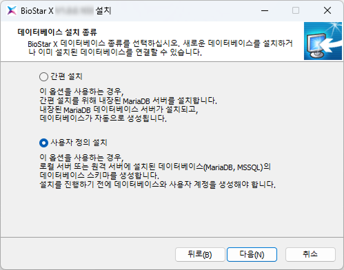 이 문서에서는 사용자 정의 설치 방식으로 BioStar X를 설치하는 절차를 단계별로 안내합니다. 사용자 정의 설치는 로컬 서버 또는 원격 서버에 기존에 설치된 데이터베이스(MariaDB, MS SQL Server)와 연동하여 데이터베이스 스키마를 생성합니다. 설치를 시작하기 전에 연동할 데이터베이스와 사용자 계정을 미리 준비하세요.