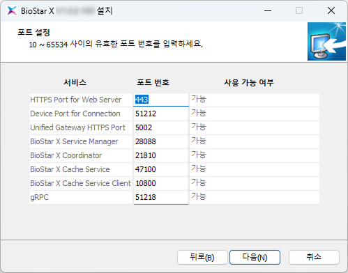 BioStar X의 통신을 위한 포트를 설정하고 다음 버튼을 클릭하세요.