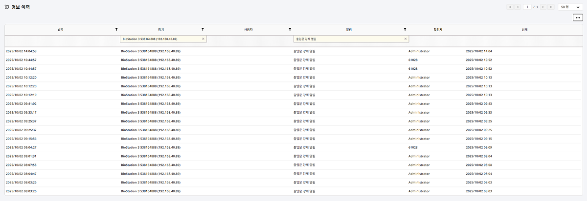 경보(알람) 이력만 조회할 수 있습니다. 화면 왼쪽 사이드바에서 이벤트 → 경보 이력을 클릭하세요.