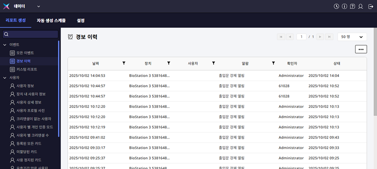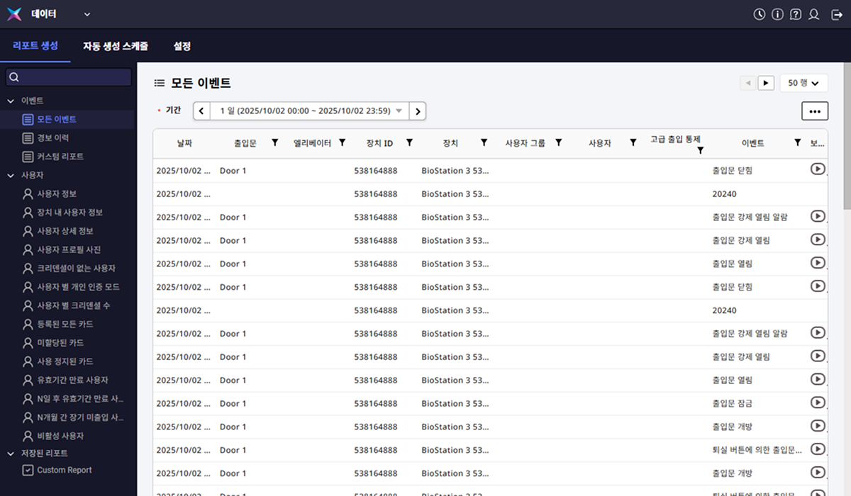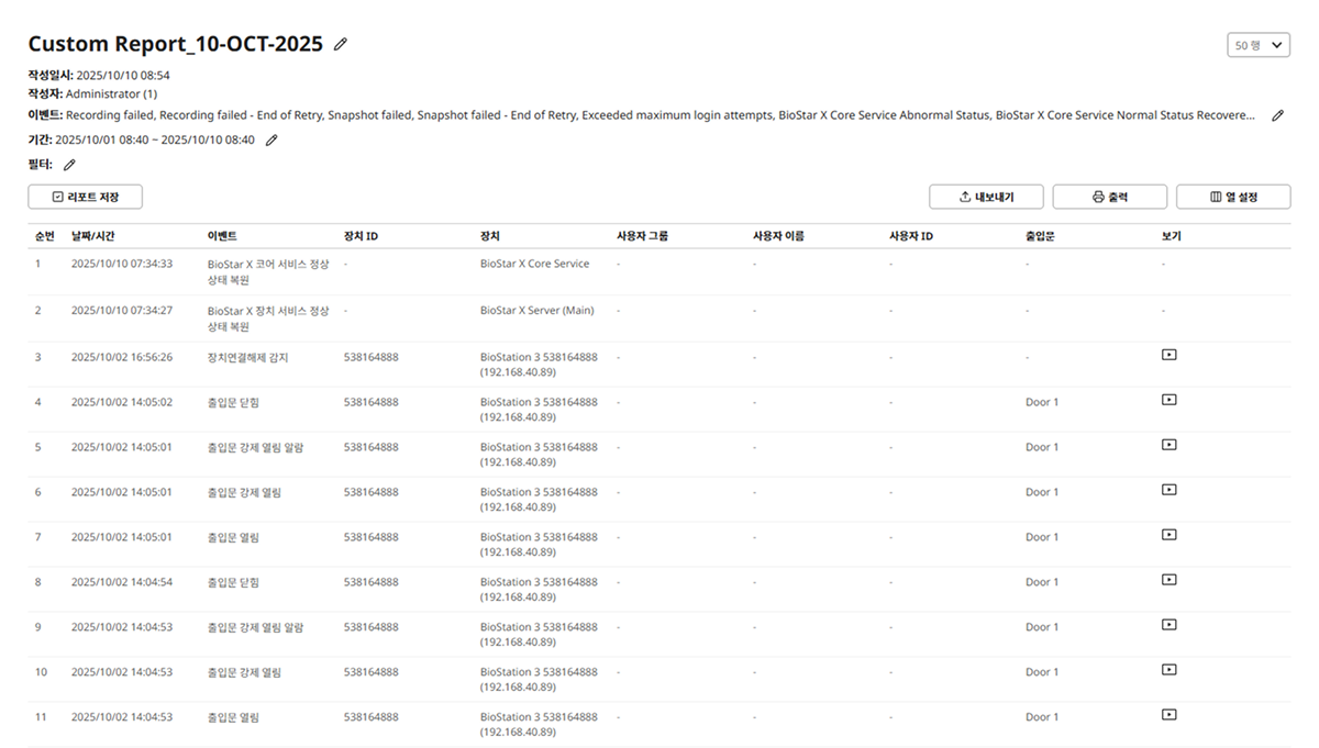 BioStar X에서 발생한 모든 이벤트를 조회하거나 경보 이력만 조회할 수 있습니다. 사용자가 원하는 조건에 맞게 필터링하여 커스텀 리포트를 생성할 수도 있습니다.