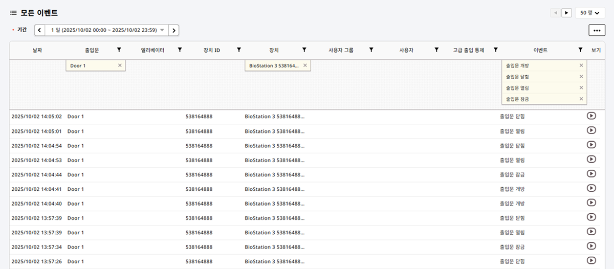 BioStar X에서 발생한 모든 이벤트를 조회할 수 있습니다. 화면 왼쪽 사이드바에서 이벤트 → 모든 이벤트를 클릭하세요.