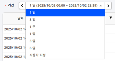 오늘 날짜를 기준으로 1일부터 6달까지 사전 정의된 기간을 선택할 수 있습니다. 원하는 기간을 선택하면 해당 기간에 발생한 이벤트가 목록에 자동 표시됩니다.