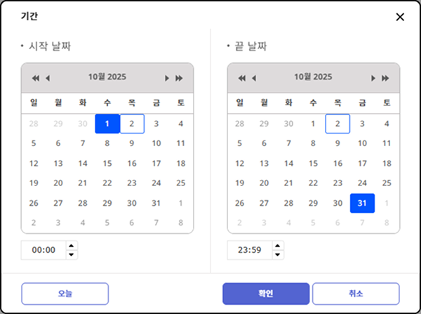 사용자 지정을 선택하면 원하는 기간을 직접 설정할 수도 있습니다. 기간 선택 창이 나타나면 시작 날짜와 종료 날짜, 시간을 설정하고 확인 버튼을 클릭하세요. 설정한 기간에 발생한 이벤트가 목록에 자동 표시됩니다.