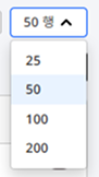 목록에 표시할 행의 수를 변경하려면 화면 오른쪽 상단의 드랍다운 메뉴를 클릭하고 원하는 값을 선택하세요. 최소 25행부터 최대 200행까지 선택할 수 있습니다.