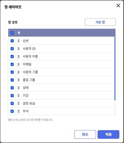 열의 순서를 변경하려면 원하는 열을 클릭한 채로 드래그하여 위치를 변경하세요.