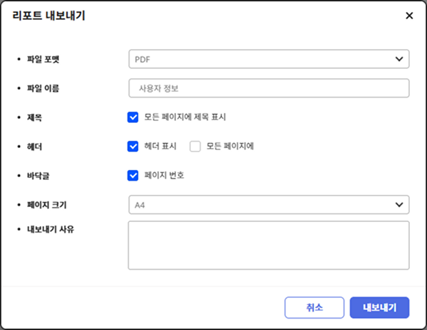 리포트를 PDF 또는 CSV 파일로 내보내려면 내보내기 버튼을 클릭하세요. 리포트 내보내기 창이 나타나면 각 항목을 설정하고 내보내기 버튼을 클릭하세요.