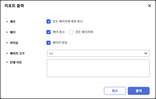 PC와 연결된 프린터로 리포트를 인쇄하려면 출력 버튼을 클릭하세요. 리포트 출력 창이 나타나면 각 항목을 설정하고 출력 버튼을 클릭하세요.