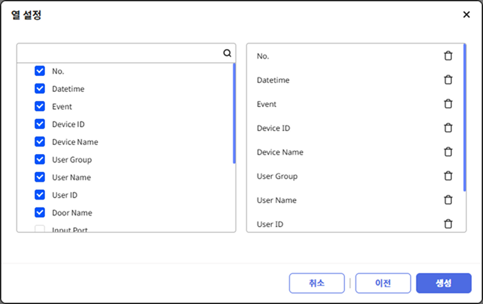 열 설정 창에서 리포트에 표시할 컬럼을 선택하세요.