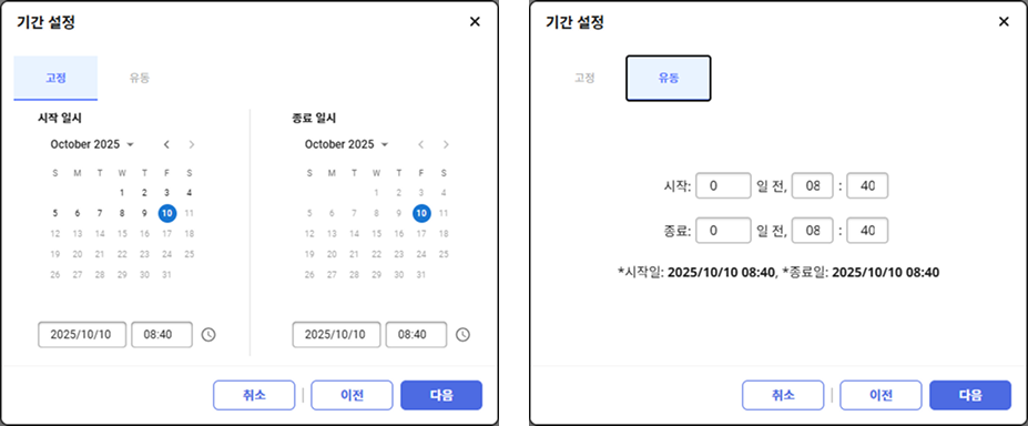 유동: 오늘 날짜를 기준으로 시작일, 종료일, 시간을 설정할 수 있습니다. 반복적으로 일정 기간의 리포트를 생성할 때 유용합니다.